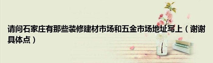 导读 大家好,小编慧慧来为大家解答以上的问题。请问石家庄有那些装修建材市场和五金市场地址写上,谢谢具体点很多人还不知道,现在让我们一起来