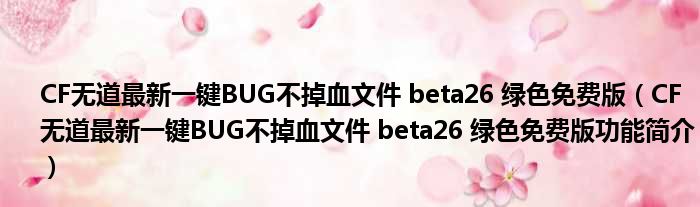 导读 大家好,关于CF无道最新一键BUG不掉血文件 beta26 绿色免费版,CF无道最新一键BUG不掉血文件 beta26 绿色免费版功能简介这个很多人还不
