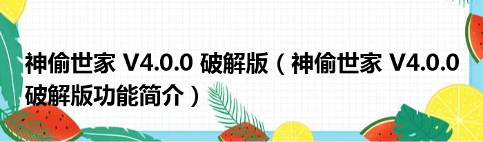 导读 大家好,关于神偷世家 V4 0 0 破解版,神偷世家 V4 0 0 破解版功能简介这个很多人还不知道,小勒来为大家解答以上的问题,现在让我们一起