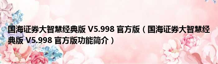 导读 大家好,关于国海证券大智慧经典版 V5 998 官方版,国海证券大智慧经典版 V5 998 官方版功能简介这个很多人还不知道,小勒来为大家解答以