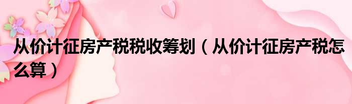 导读 大家好,今天小六子来为大家解答以下的问题,关于从价计征房产税税收筹划,从价计征房产税怎么算这个很多人还不知道,现在让我们一起来看看