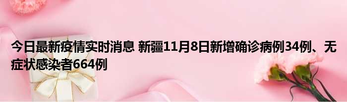 据新疆卫健委,11月8日0时至24时,新疆维吾尔自治区新增确诊病例34例,新增无症状感染者664例,新增确诊病例治愈出院9例,新增无症状感染